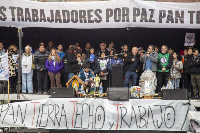 La convocatoria “Paz, Pan, Tierra, Techo y Trabajo” de las organizaciones sociales contó por segunda vez consecutiva con el apoyo y acompañamiento de la CGT y reunió a expresiones sindicales como las dos CTA, movimientos sociales y campesinos, estudiantiles, comunidades religiosas, organizaciones feministas como Ni Una Menos, organismos de derechos humanos y múltiples actores del campo popular.